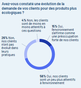- 57 % des répondants considèrent que la transition écologique a un impact « fort » ou « assez fort » sur la vente et la relation clients. Ainsi, la capacité à expliquer et valoriser les qualités écologiques des produits vendus sera déterminante pour gagner la confiance des consommateurs.