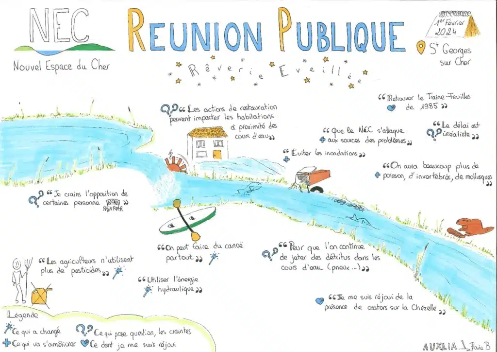 La concertation a été conçue comme un parcours d’initiation, guidant pas à pas les participants dans la compréhension des fonctions des cours d’eau et l’intérêt d’agir à leur restauration. Lors de la première réunion publique, l’objectif était de faire comprendre concrètement ce qu’implique un cours d’eau fonctionnel et de montrer comment sa dégradation peut générer des risques pour les territoires. Le second objectif était de partager l’état des lieux des affluents issu du diagnostic technique et de confronter celui-ci aux ressentis et aux expériences des riverains. Après quoi, ces derniers ont été invités à partager leurs attentes et leurs craintes au travers d’une “rêverie éveillée”. Cet outil consiste à projeter les habitants dans un futur idéal à l’aide d’une histoire racontée par un.e animateur.trice et à se représenter concrètement des paysages, des usages et des évolutions possibles pour leur territoire. Cette mise en situation permet de mobiliser les perceptions, les imaginaires et les émotions.